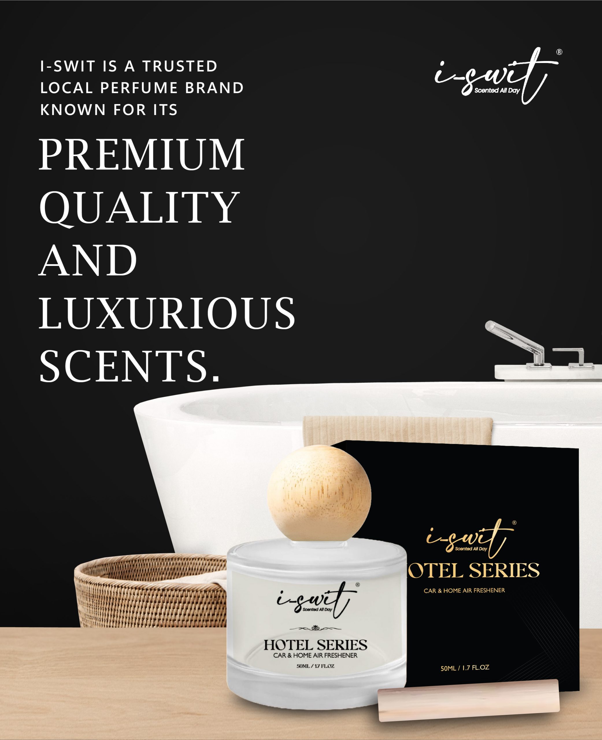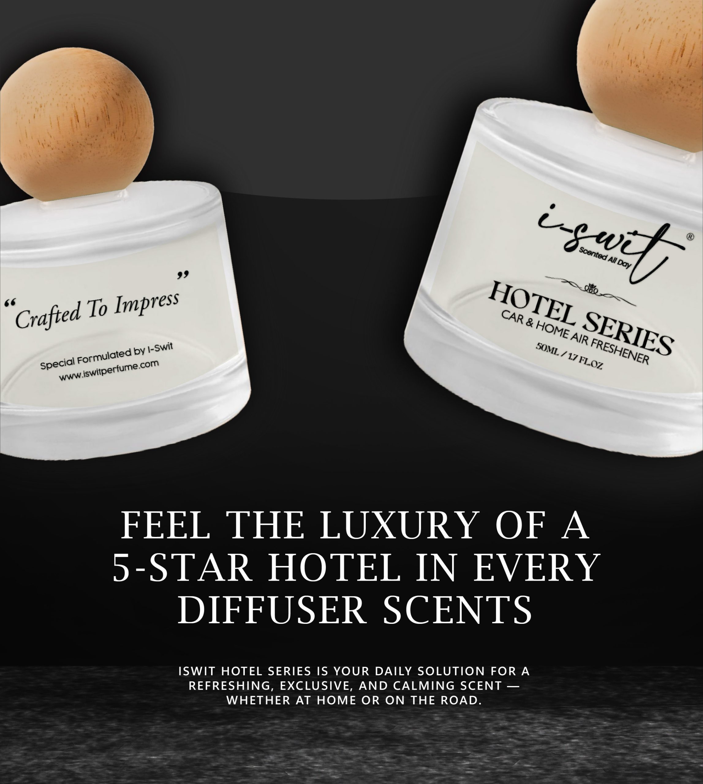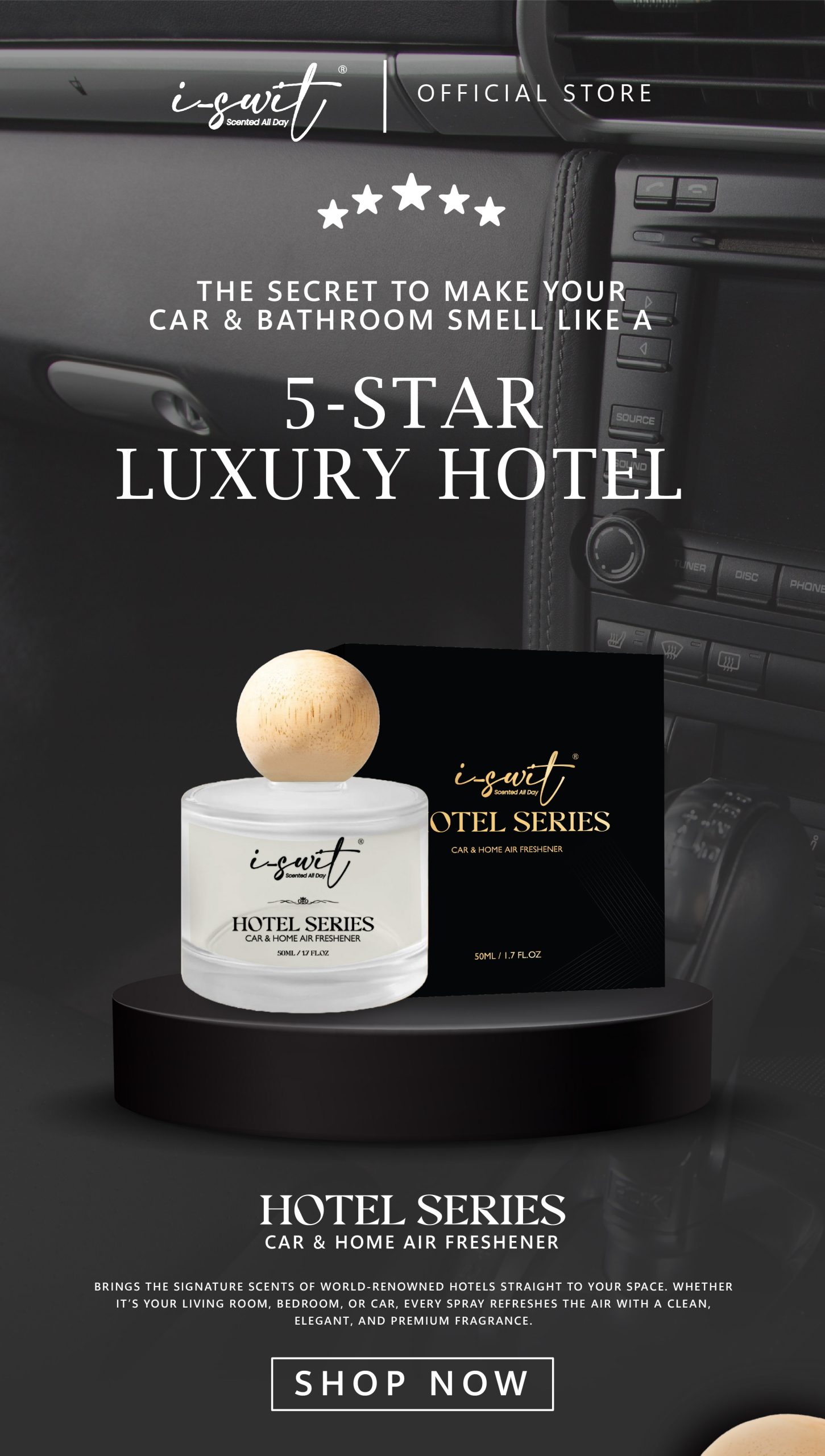 Combo Promo! Car & Home Air Freshener Once you’ve submitted your order, we will contact you as soon as possible and your tracking number will be sent to you via WhatsApp immediately. Fast Delivery Delivery within 1–3 working days via NINJAVAN courier. Order before 12PM and we’ll ship it out on the same day! 100% Trusted Seller i-Swit is also a highly trusted brand with thousands of positive testimonials. And no worries — you only pay when the item arrives! iSwit Hotel Series FAQ What is iSwit Hotel Series? A premium fragrance collection for homes, offices, and cars inspired by iconic 5-star hotel scents. What does it smell like? Fresh, luxurious, and calming aromas — just like stepping into a hotel lobby or suite. Where can I use it? Perfect for bedrooms, living rooms, offices, cars, or any space you want to feel elegant and cozy. How long does the scent last? Spray bottle: Up to 3 months (depending on usage).Reed diffuser: 2–3 months. What scents are available? 1.Velmara – Marriot Hotel2. Carlisse – Ritz Carlton Hotel3.Contessa – Continental Hotel4. Hilvora – Hilton Hotel5. Langsera – Shangri-La Hotel6. Forenza – Four Seasons Hotel Is the scent too strong? No. It’s well-balanced — noticeable but not overpowering, creating a comfortable and classy atmosphere. Is it safe for kids and pets? Yes, it’s made with safe ingredients for home use. Avoid direct contact with skin or eyes. How do I use it? Spray: Spray into the air, on curtains, sofas, or fabrics (avoid spraying directly on skin).Diffuser: Place the sticks in the bottle and let the aroma spread naturally. Do you offer a product guarantee? We ensure every item is in good condition before shipping. If it’s damaged during delivery, contact us for a replacement. Where can I buy it? Through iSwit’s official link or from our official shop on other shopping platforms. Anda Perlukan Bantuan?Whatsapp: +60103311669 (9:00am – 6:00pm) All Rights Reserved. Copyright @iswitperfume_2025No 33-3f JLN Setia Perdana, Bandar Setia Alam,40170, Shah Alam Selangor.