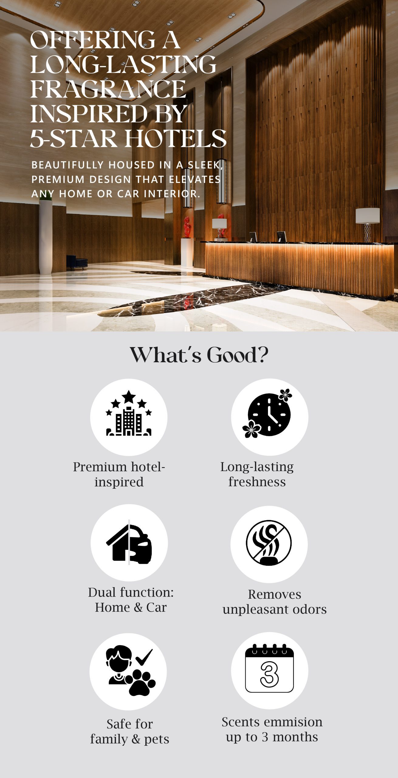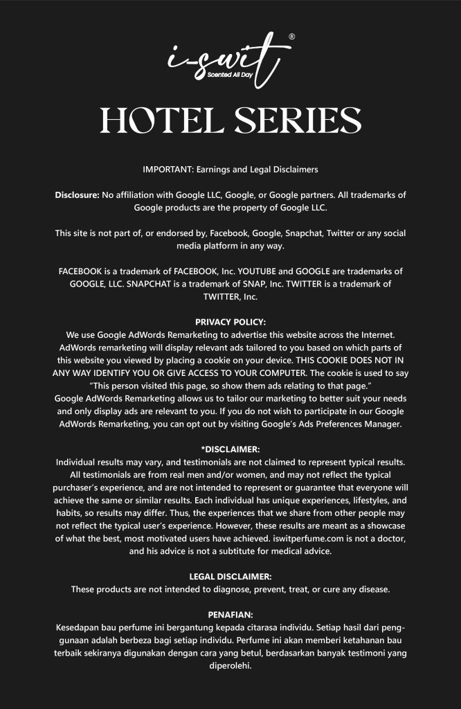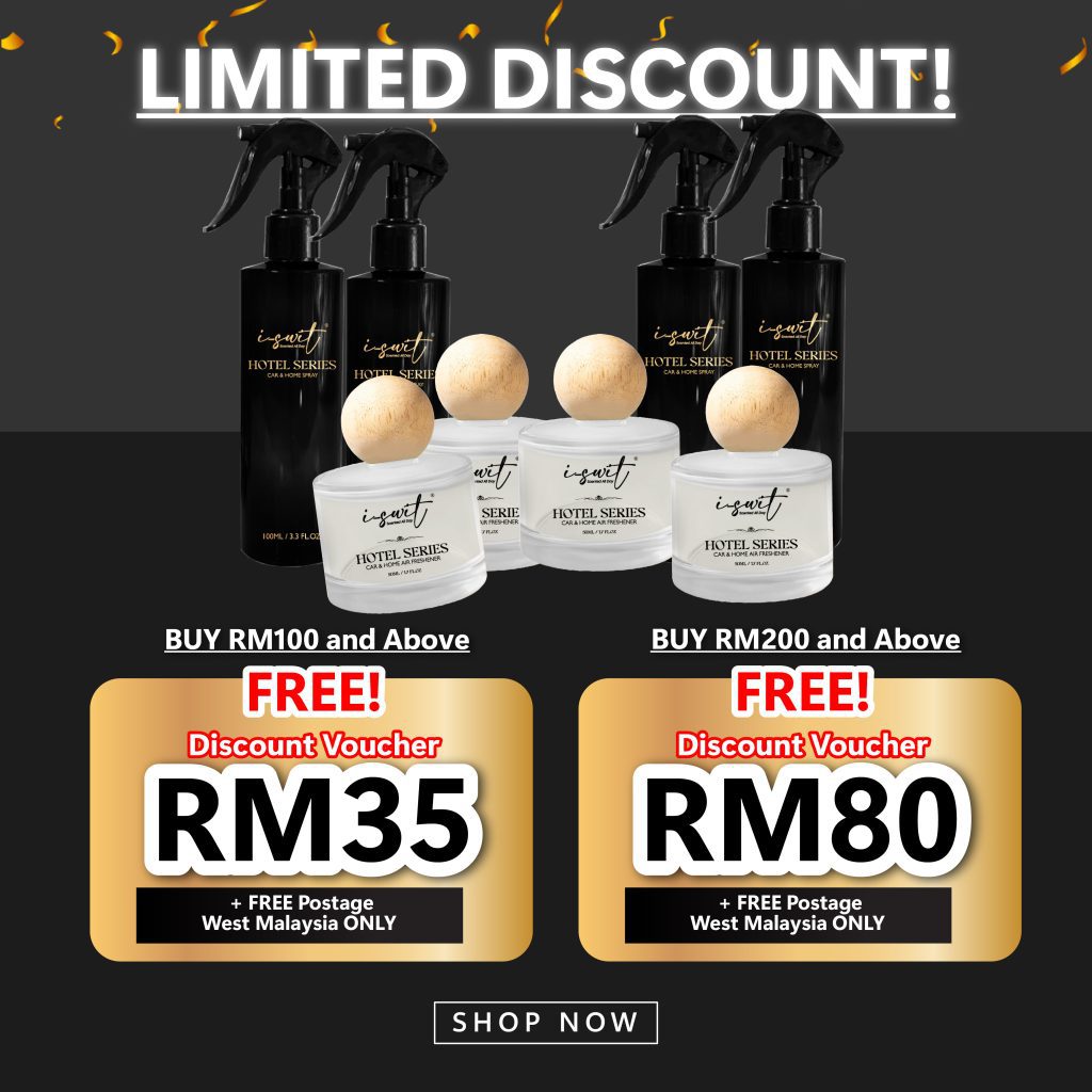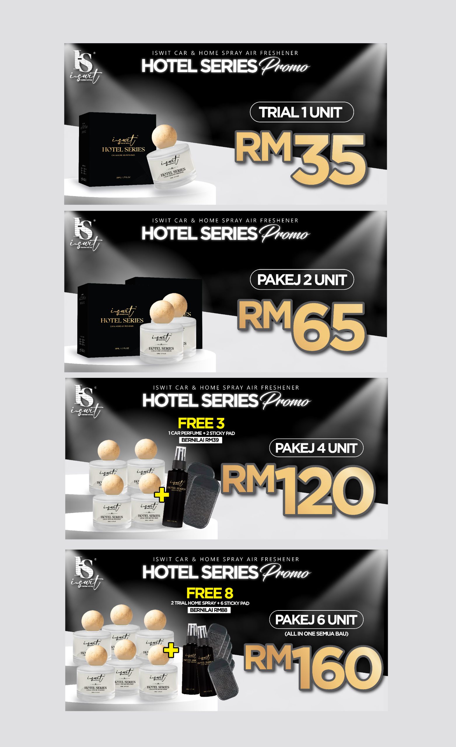 Combo Promo! Car & Home Air Freshener Once you’ve submitted your order, we will contact you as soon as possible and your tracking number will be sent to you via WhatsApp immediately. Fast Delivery Delivery within 1–3 working days via NINJAVAN courier. Order before 12PM and we’ll ship it out on the same day! 100% Trusted Seller i-Swit is also a highly trusted brand with thousands of positive testimonials. And no worries — you only pay when the item arrives! iSwit Hotel Series FAQ What is iSwit Hotel Series? A premium fragrance collection for homes, offices, and cars inspired by iconic 5-star hotel scents. What does it smell like? Fresh, luxurious, and calming aromas — just like stepping into a hotel lobby or suite. Where can I use it? Perfect for bedrooms, living rooms, offices, cars, or any space you want to feel elegant and cozy. How long does the scent last? Spray bottle: Up to 3 months (depending on usage).Reed diffuser: 2–3 months. What scents are available? 1.Velmara – Marriot Hotel2. Carlisse – Ritz Carlton Hotel3.Contessa – Continental Hotel4. Hilvora – Hilton Hotel5. Langsera – Shangri-La Hotel6. Forenza – Four Seasons Hotel Is the scent too strong? No. It’s well-balanced — noticeable but not overpowering, creating a comfortable and classy atmosphere. Is it safe for kids and pets? Yes, it’s made with safe ingredients for home use. Avoid direct contact with skin or eyes. How do I use it? Spray: Spray into the air, on curtains, sofas, or fabrics (avoid spraying directly on skin).Diffuser: Place the sticks in the bottle and let the aroma spread naturally. Do you offer a product guarantee? We ensure every item is in good condition before shipping. If it’s damaged during delivery, contact us for a replacement. Where can I buy it? Through iSwit’s official link or from our official shop on other shopping platforms. Anda Perlukan Bantuan?Whatsapp: +60103311669 (9:00am – 6:00pm) All Rights Reserved. Copyright @iswitperfume_2025No 33-3f JLN Setia Perdana, Bandar Setia Alam,40170, Shah Alam Selangor.